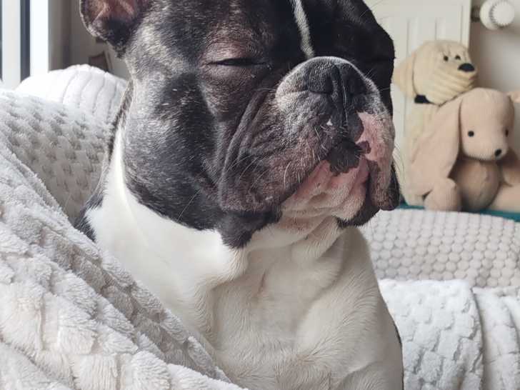Il est de couleur caille bringé et porteur de bleu lilas. Il n'est pas inscrit au LOF, mais il est issu d'une lignée de Bouledogues Français.