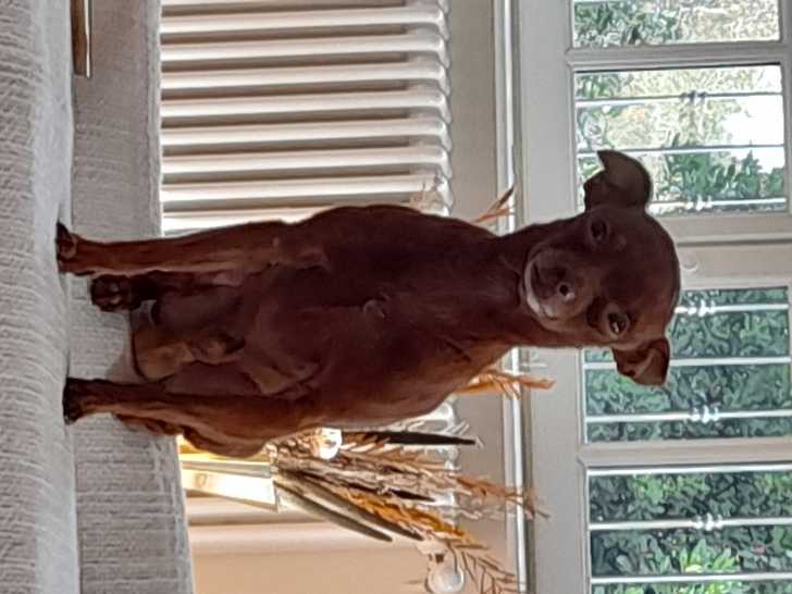 Fredie va avoir 3 ans en novembre 2022. Il est en forme. Sa robe est de couleur chocolat. Il est issu de deux parents Pinscher Nain.