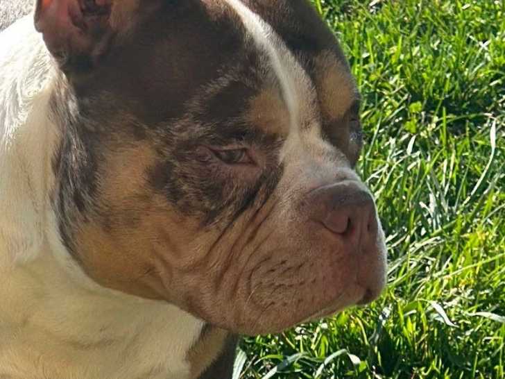 Nous vous proposons un superbe chien mâle American Bully Pocket à la robe merle tricolore et chocolat inscrit dans le Livre des Origines Français (LOF), issu de lignées prestigieuses, prêt à reproduire votre femelle.