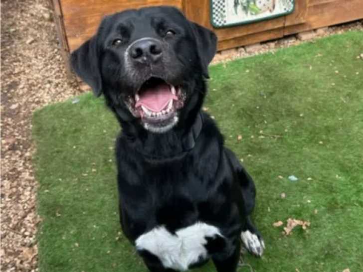Nous avons le plaisir de vous proposer à l'adoption Alpha, un chien noir avec marque blanche âgé de trois ans. Il est sociable et a beaucoup d'amour à donner.