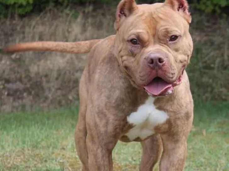 Nous vous proposons à l'adoption ce chien American Bully au pelage marron et blanc de trois ans nommé Tobi. Il ne peut pas cohabiter avec ses congénères mâles et les chats.