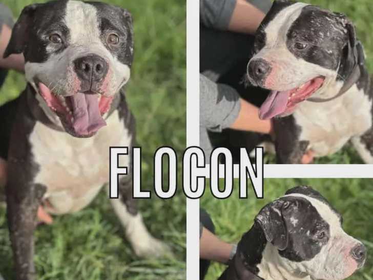 Notre association est ravie de vous proposer à l’adoption Flocon, un chien American Bully au pelage noir et blanc de trois ans. Il ne peut pas cohabiter avec les chats et ses congénères mâles.