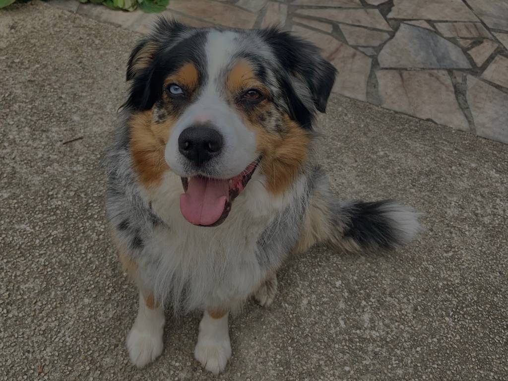 C'est un chien de famille équilibré, sociable et en excellente santé. Il a 4 ans. Il n'est pas inscrit au LOF, mais ses parents sont des Bergers Australiens. Il est de couleur bleu merle tricolore et a les yeux vairons.