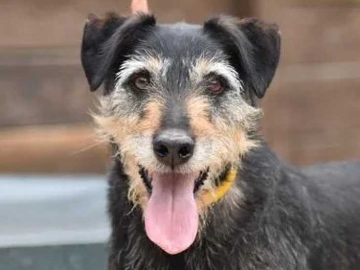 Arborant un pelage noir avec marque blanche, Mambo est un chien âgé de huit ans que nous vous proposons à l'adoption. Il recherche un foyer qui lui offrira une belle vie.