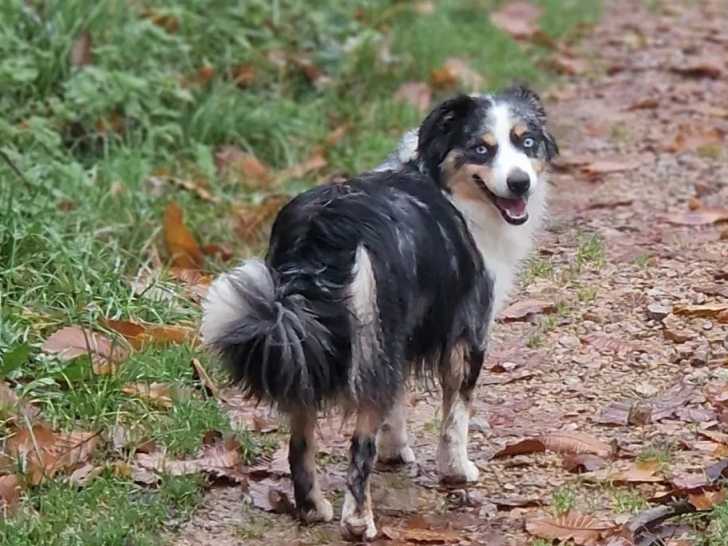 Saphir, un chien femelle Berger Américain Miniature inscrite dans le Livre des Origines Français (LOF), cherche une famille aimante. Bleu merle à queue longue, elle mesure 36 cm pour 12 kg.