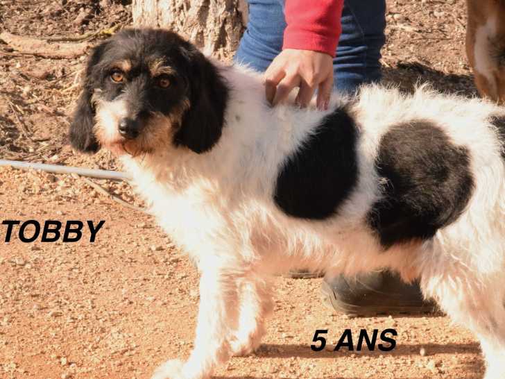 Nous vous proposons Tobby, un adorable chien Griffon au pelage noir et blanc, âgé de cinq ans. C’est un chien peureux, notamment lorsqu’on a des gestes brusques. Il n'a aucune agressivité et est tellement gentil.