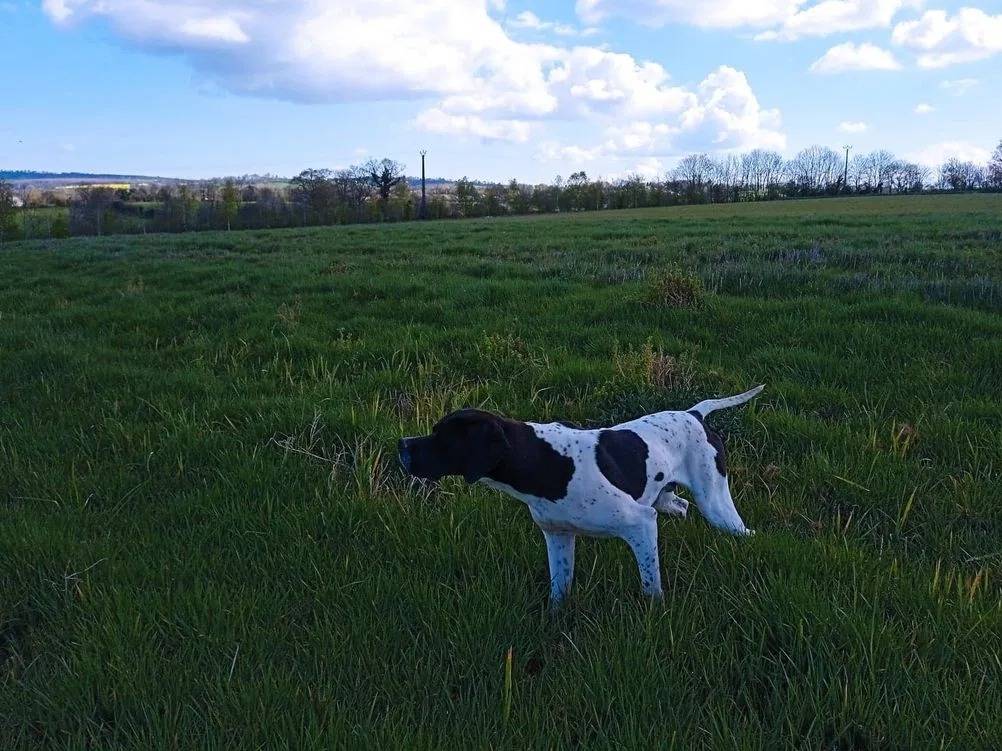 Sur une portée de chiens Pointer Anglais, il reste un mâle adulte à vendre. Saxo des cimes du bocage, noir et blanc avec un excellent pédigrée travail et beauté, est disponible pour 1800 euros.