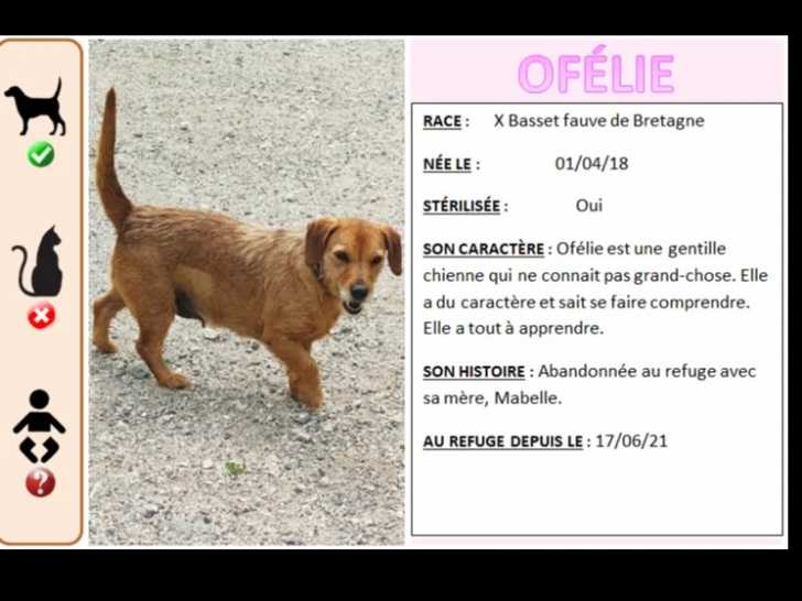 De couleur fauve, Ofelie est une chienne Basset Fauve de Bretagne âgée de sept ans que nous sommes enchantés de vous proposer à l'adoption. Elle espère trouver une famille aimante et sans chats pour une vie paisible.