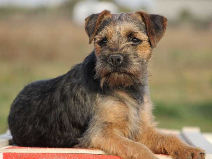 Nous vous présentons une magnifique chienne Border Terrier de couleur gris marqué de fauve, inscrite au Livre des Origines Français (LOF).