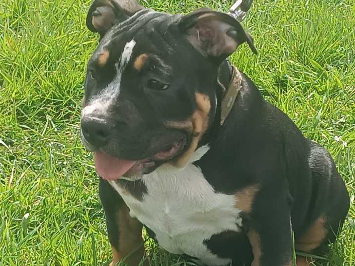 Un magnifique mâle American Bully tricolore noir est disponible. Il est testé ADN Embark. Il a 3 mois et demi. Les parents sont testés. Il a son coupon ABKC provisoire.