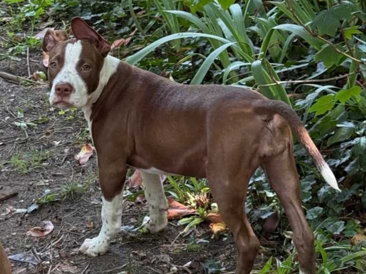 C'est une femelle marron tachée aux pattes. Elle est très belle. Elle est âgée de 4 mois. Elle a été sevrée très tôt. Elle est habituée aux autres chiens. Elle est plutôt joueuse et coquine.