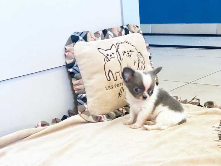 Il nous reste un merveilleux chiot Chihuahua LOF extra miniature né le 14 octobre 2021. Il pesait 59 grammes à la naissance. Shalimar est de robe bleue et blanche. C'est un magnifique bébé que nous vendons pucé, vacciné et vermifugé au prix de 3500 euros.