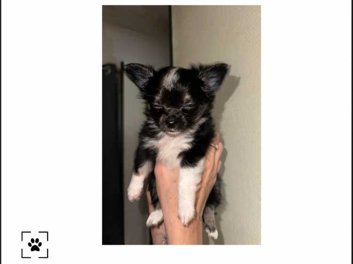 Nous vendons un chiot Chihuahua de couleur noir et blanc avec des taches marron. Il est très joueur et il aime les autres animaux.