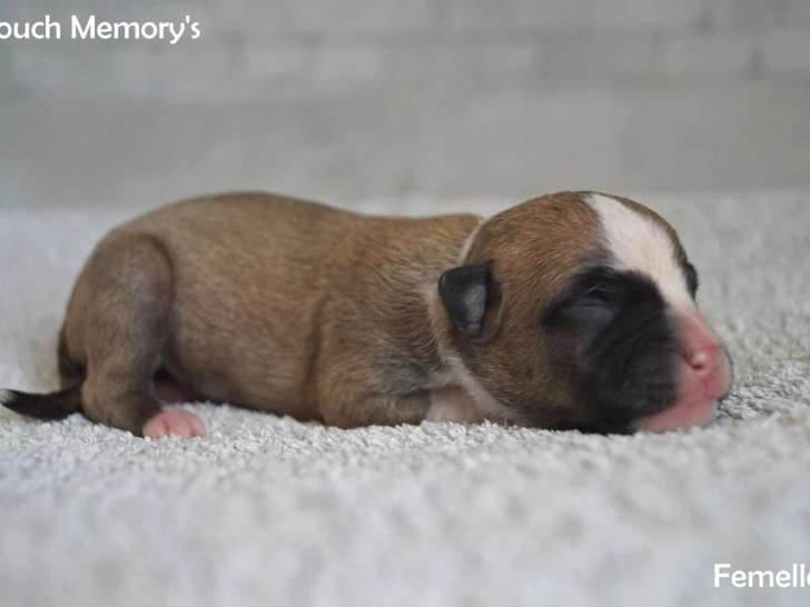 Née le 23 février 2026 à angivillers, cette femelle American Staffordshire Terrier est issue de notre affixe Arouch Memory’s. Sa silhouette se dessine déjà avec précision et elle présente une robe bringé...