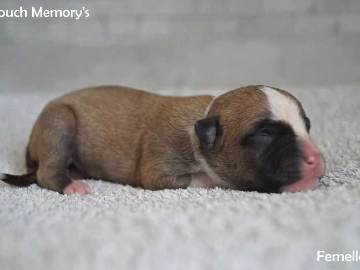 Parmi nos six chiots nés le 23 février 2026 à angivillers, cette femelle se distingue par son gabarit encore discret. Si elle est pour l’instant la plus petite de la portée, elle reste tout de même une authentique femelle American Staffordshire Terrier à la robe fauve pan blanc relevée d’un masque noir expressif.