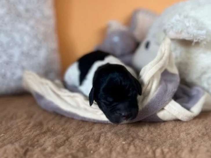 Les chiots, au pelage blanc et marron typique de la race, seront disponibles à partir du 6 avril 2026. Ils rejoindront leur future famille vaccinés et identifiés, prêts à débuter une nouvelle vie en toute sérénité.
