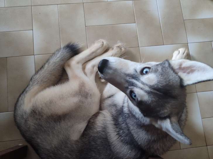 vends chiot femelle Husky de 8 mois, non LOF. Elle est blanc gris et a les yeux bleus.
