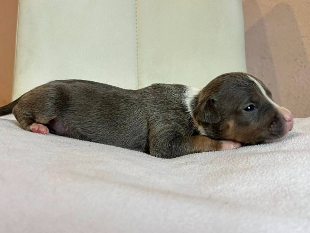 Depuis le 22 janvier 2026, date de sa naissance, ce chiot grandit chez nous au milieu d’une fratrie de neuf chiots. C’est une femelle American Staffordshire Terrier inscrite au Livre des Origines Français (LOF...