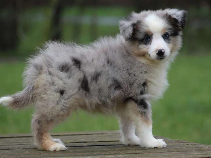Sa robe bleu merle accompagnée de yeux bleus donne à son regard une expression vive et attentive. Ce jeune mâle conserve une queue longue et évolue quotidiennement dans un environnement dédié à la socialisation progressive des chiots. Vacciné et identifié, il est proposé au prix de 1600 euros. Il est disponible en réservation depuis le 20 février 2026 et rejoindra sa famille avec trente jours d’assurance Fidanimo.