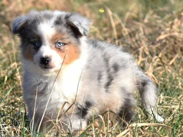 Un chiot Berger Américain à la robe bleu merle, avec un œil bleu, un œil particolore et une queue longue est disponible la vente à notre élevage.