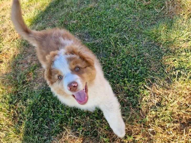 Superbe chiot mâle Berger Australien rouge merle à queue longue, inscrit au Livre des Origines Français (LOF), né le 27 février 2025, issu d'une portée de 7 chiots. Il est vacciné (CHPPI, leptospirose, toux du chenil), pucé, vermifugé et partira avec un certificat de bonne santé, un carnet de santé, un certificat de naissance LOF, une documentation, des conseils et un kit pour chiot.
