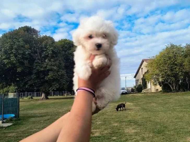 Nous proposons un chiot mâle Bichon Maltais disponible suite à un désistement. Né le 4 juillet 2025, il est habitué aux enfants et à la vie de famille, avec son caractère sociable et joueur.