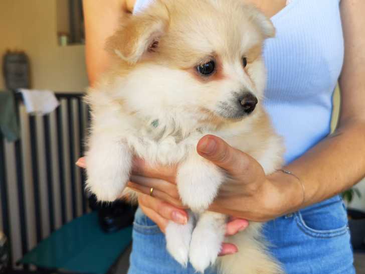 Le papa est un Spitz, la maman un Pomsky F1. Albus devrait faire aux alentours de 5/6kg à l'âge adulte.