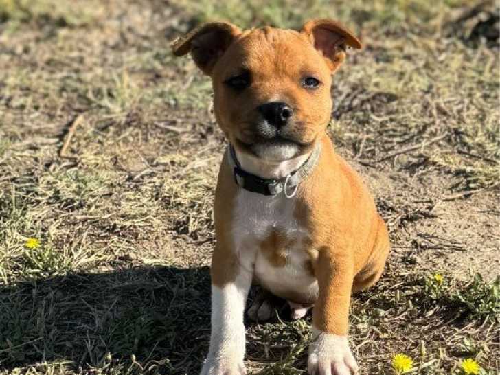 Nous proposons un mâle Staffordshire Bull Terrier LOF, sevré et disponible dès maintenant. Il est élevé en famille et parfaitement sociabilisé avec enfants et autres animaux.