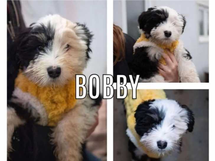 Nous vous proposons à l'adoption Bobby, un chiot mâle au pelage noir et blanc de trois mois en quête d'un foyer aimant qui prendra soin de lui.