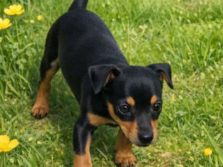 Né le 23 février 2026, ce chiot Pinscher Nain mâle à la robe noire et feu est disponible à la vente. Il est identifié par puce électronique et a reçu sa première vaccination.