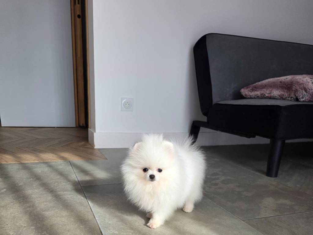Nos deux loulous se sont unis pour donner naissance à des merveilles. Snow est disponible de suite, il a deux mois et demi. C'est un véritable Poméranien de type ourson, c'est un pompon blanc. Il est si câlin, curieux et dégourdi qu’il est incroyablement mignon. Il vit en famille avec un chat et un chien et notre fille de 8 ans, avec qui il est complice.