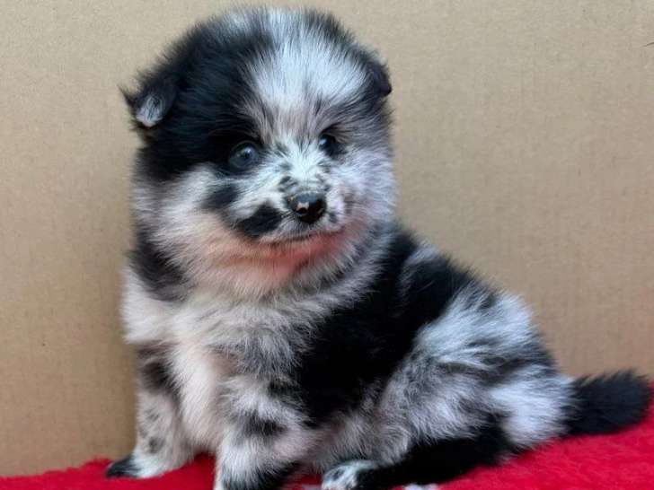 Ce chiot présente une robe bleu merle peu commune, agrémentée d'un œil bleu, et arbore une très belle fourrure caractéristique de la race. Il est vendu au prix de 1 200 euros.