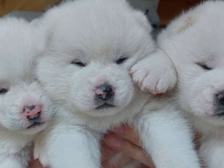 3 adorables chiots Akita Inu blancs, 2 mâles et 1 femelle, sont nés le 4 février 2025. Ils sont à réserver, ils seront disponibles à 10 semaines, mi-avril. Ils seront pucés, vaccinés et inscrits au LOF.