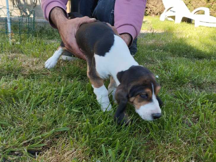 Je vends des chiots Basset Artésien Normand nés le 01/02/2025. Il reste 1 femelle.