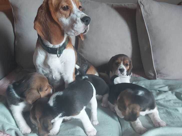 5 chiots Beagle tricolores sont nés le 28/01/2024 et seront disponibles à partir du 25/03/2024.