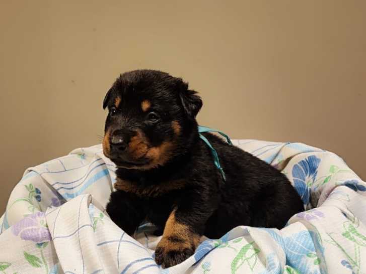 Le papa est un beau mâle noir et feu. Il a la cotation 4, il est testé HD A et DNA. Lartigue est un chien adorable qui vient de passer son niveau 2 en recherche utilitaire. Foncièrement gentil, c'est un gardien imposant derrière son portail. Il est très proche de son humain également.