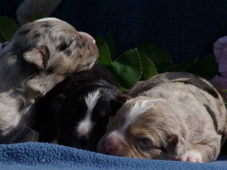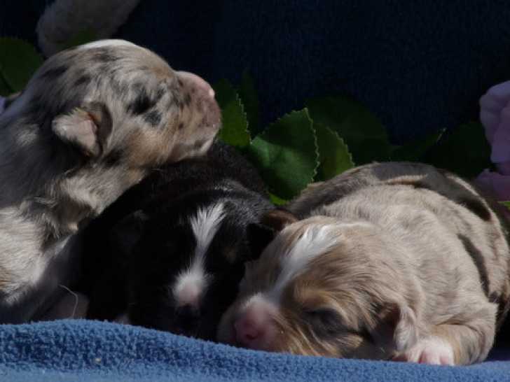 - les chiots de Tzigane, nés le 20/09/2025, de couleur rouge tricolore, noir tricolore, merle rouge et bleu.