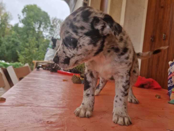 Il y a 1 chiot bleu merle. Les autres chiots seront de couleur uniforme.