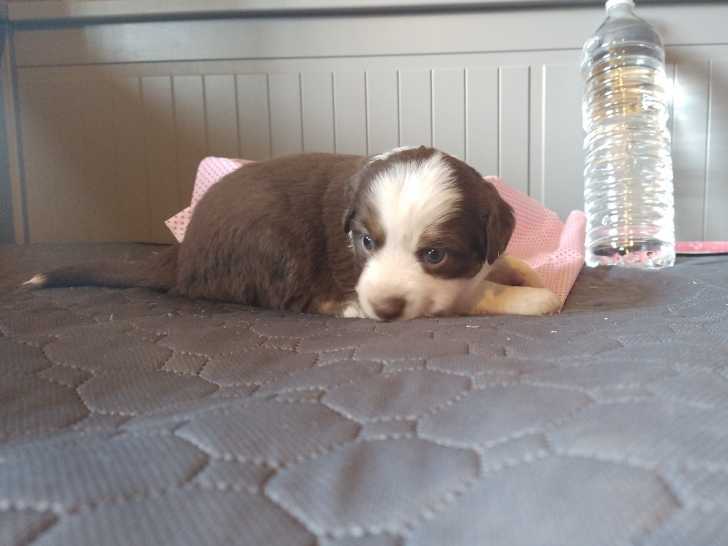 La mère est inscrite au registre américain des chiens de race. C'est une chienne bleu merle à la queue longue et aux yeux bleus. Le père est inscrit au LOF. Il est rouge tricolore, NBT et a les yeux vairons.