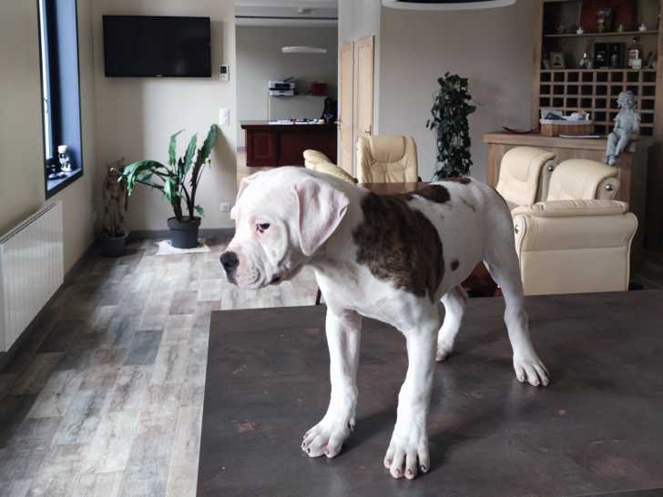 Notre mâle Bouledogue Américain nommé Oover est un chien robuste et actif, né le 14/02/2018. Il est élevé dans un environnement familial avec d’autres animaux et des enfants. Ce chien très doux bénéfici...