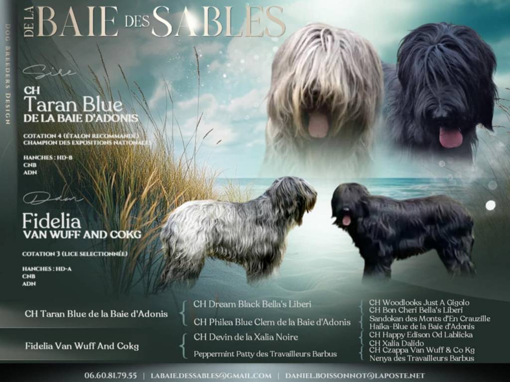 La mère est Fidelia van Wuff and Cokg. C'est une femelle noire cotée 3. Elle est testée ADN, pour la CNB (OK) et la dysplasie (A). Le père est le champion Taran Blue de la Baie d'Adonis. C'est un mâle bleu coté 4. Il est testé ADN, pour la CNB (OK) et la dysplasie (B). Les deux ont d'excellentes origines, avec des parents champions.