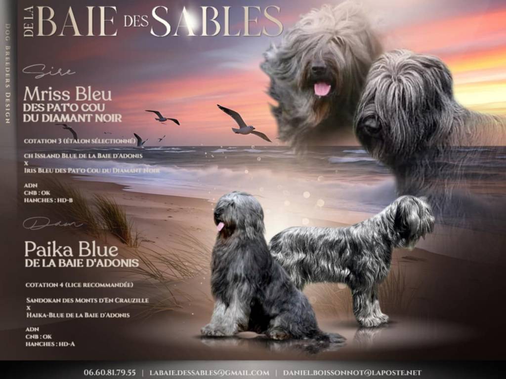 La mère est Paika Blue de la Baie d'Adonis. Elle est cotée 4 recommandée, elle est testée pour la CNB, ADN (OKF) et pour la dysplasie (A). Le père est Mriss Bleu des Pat O Cou du Diamant Noir,coté 3 sélectionné, testé pour la CNB, ADN (OK) et pour la dysplasie (B).