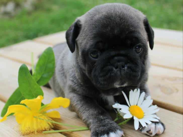 Une portée de 3 chiots Carlin nés le 2 juin 2024 .