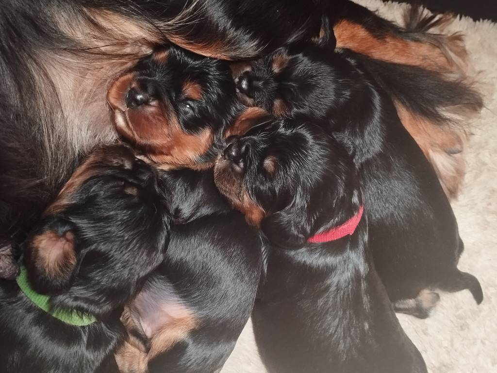 Notre adorable chienne Praline (femelle à la robe noir et feu) a donné naissance à 4 magnifiques chiots dont elle prend le plus grand soin.