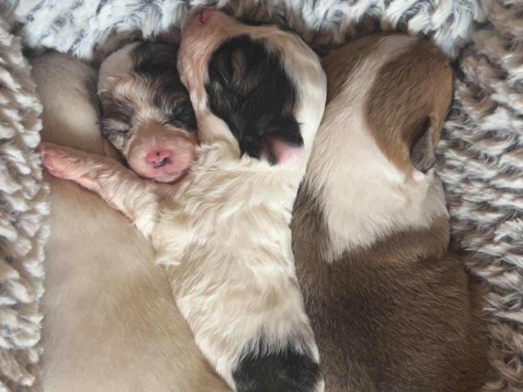 La mère est visible à la maison. Les chiots grandissent en famille, ils sont habitués aux bruits du quotidien et aux câlins.