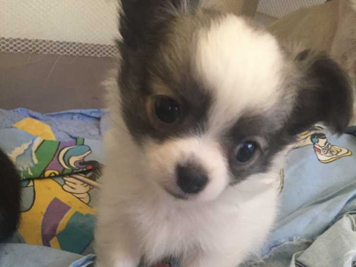 2 mâles Chihuahuas, non LOF, à poil long, sont à vendre. L'un des chiots est noir et blanc, et l'autre est blanc masque bleu.