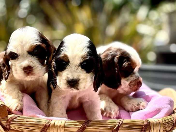 Nos chiots Cocker Spaniel Anglais nés en mai 2025 grandissent dans un environnement familial et sont manipulés dès leur plus jeune âge. Ils s’habituent aux bruits domestiques et interagissent avec leurs parents pour un développement harmonieux.