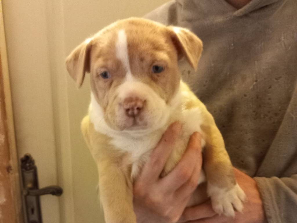 Trois adorables chiennes et un magnifique chiot, nés le 11 février dernier, croisés American Bully (75%) et Akita (25%) attendent avec impatience leur(s) propriétaire(s).