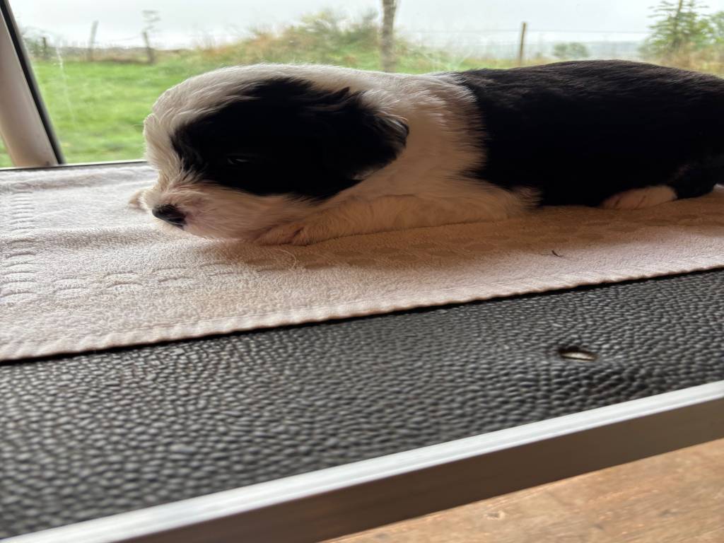Une jolie petite chienne Bobtail est encore disponible. Elle a un gros coquard à l’œil gauche. Elle est trop craquante.