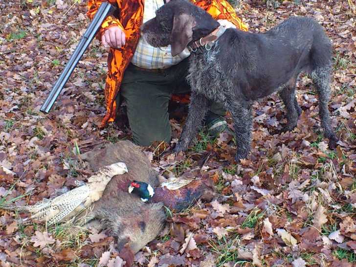 Pango et Priska forment un merveilleux et efficace duo ! Ils ont un superbe arrêt sur bécasse (leurs ancêtres sont des Braques Allemands). Elle a un magnifique flair pour débusquer les sangliers et autres gibiers qu’ils se chargent ensuite de mener à vue. Pango n’a pas peur d’un sanglier de 40 kilos.